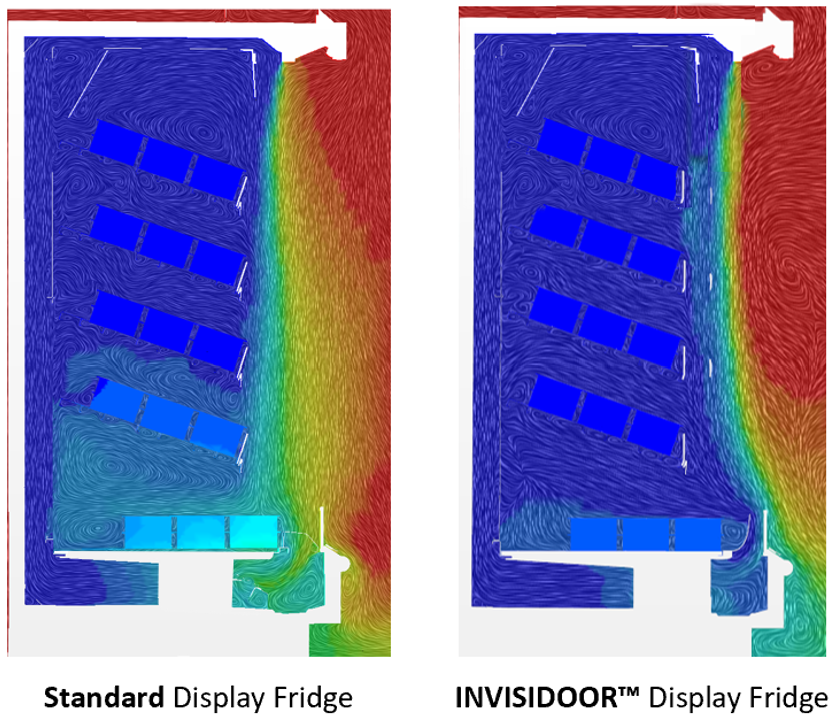 Rather than sealing the cabinet with glass, Invisidoor uses precision-engineered components, developed using advanced CFD (Computational Fluid Dynamics), to reshape and stabilise the cold-air curtain.
