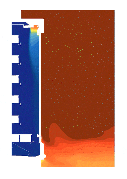 La CFD (Computational Fluid Dynamics) nous permet de mesurer l'effet de soufflet et montre pourquoi les affirmations d'économies d'énergie fixes et singulières sont trompeuses et souvent exagérées. La performance énergétique est transitoire parce que les ouvertures de porte sont transitoires.